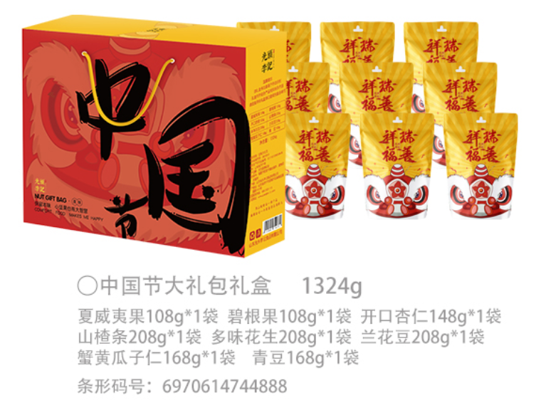 手繪團(tuán)圓飯插畫,9款紅色內(nèi)袋,分別印有:福祿壽喜財(cái)吉祥順樂(lè)9個(gè)字,象征著美好的寓意,3種堅(jiān)果、3種果蔬、3種果脯,寓意長(zhǎng)長(zhǎng)久久,將新年祝福傳遞千家萬(wàn)戶。